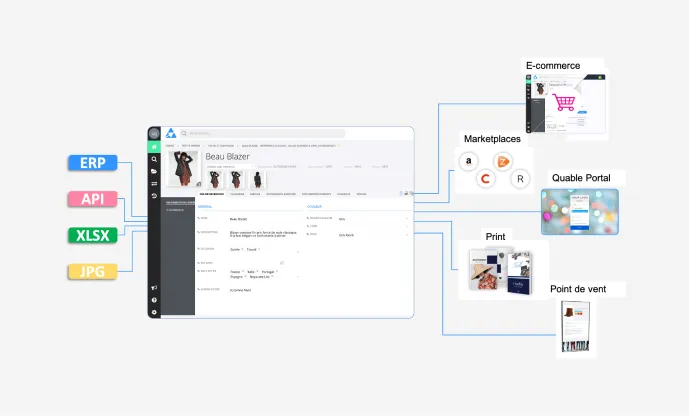 - Enrichissement et qualité des données pour assurer la cohérence et l'attrait de vos informations produit.